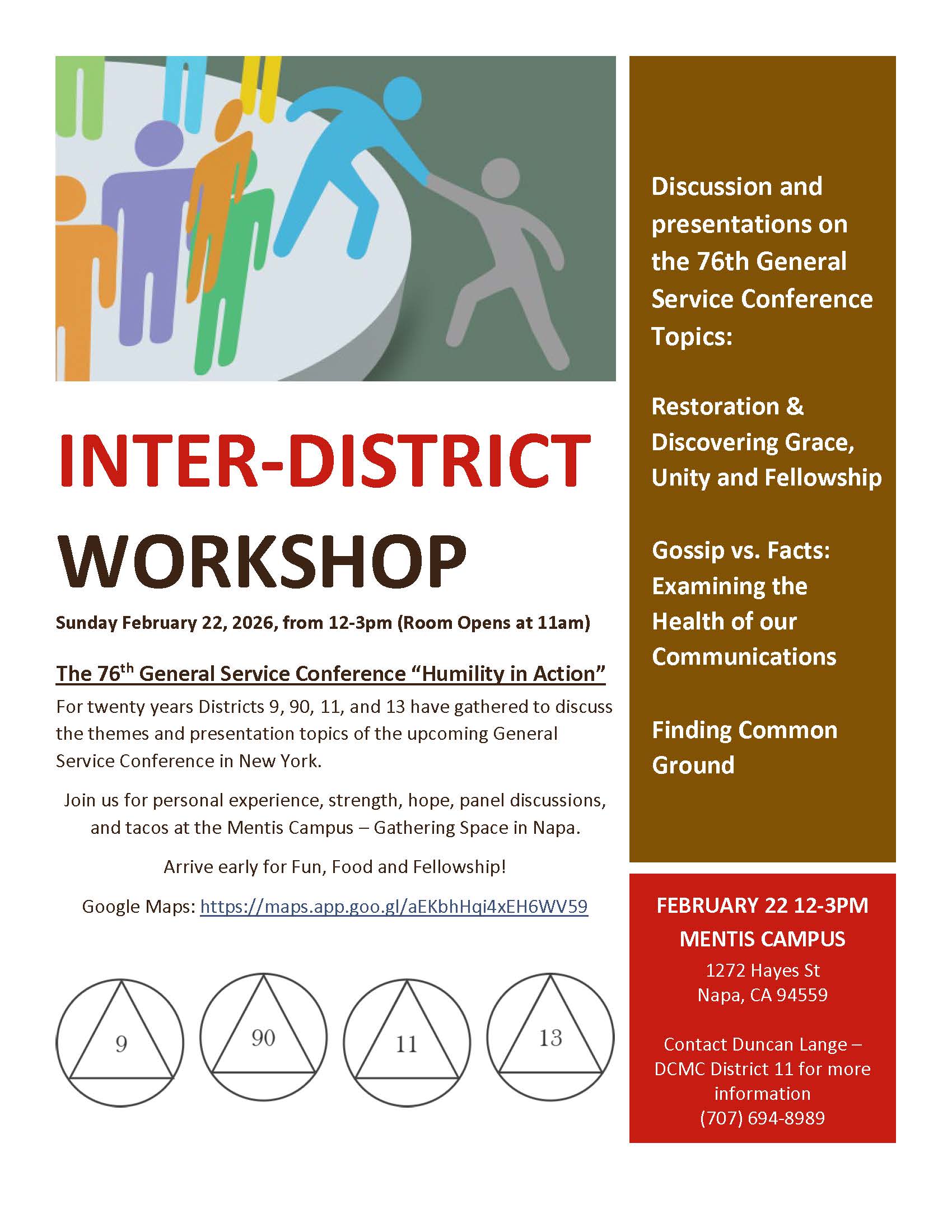 INTERDISTRICT WORKSHOP 2026by AA Napa Valleyin AA Napaon Posted on February 20, 2026February 20, 2026 Come join us to study the themes of the upcoming General Service Conference. Hosted by District 11 w/Districts 13, 9, 90 Sunday February 22nd, 12-3pm @ Mentis Campus Click Here for Flyer