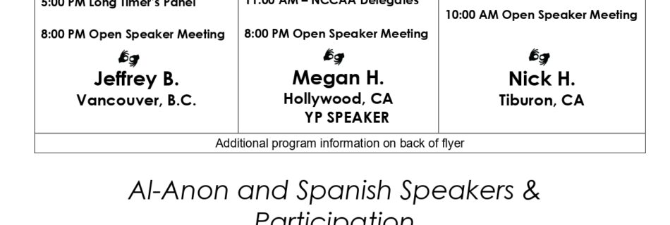 Northern California Council of Alcoholics Anonymous 77th Annual Spring Conference San Ramon, CASan Ramon Marriott2600 Bishop Dr., San Ramon, CA 94583 March 20, 21 & 22, 2026 PRE-REGISTRATION – $30.00 (per person) – AT THE CONFERENCE – $35.00 Pre-register for Conference online at norcalaa.org (Click either of the images below to download a PDF)